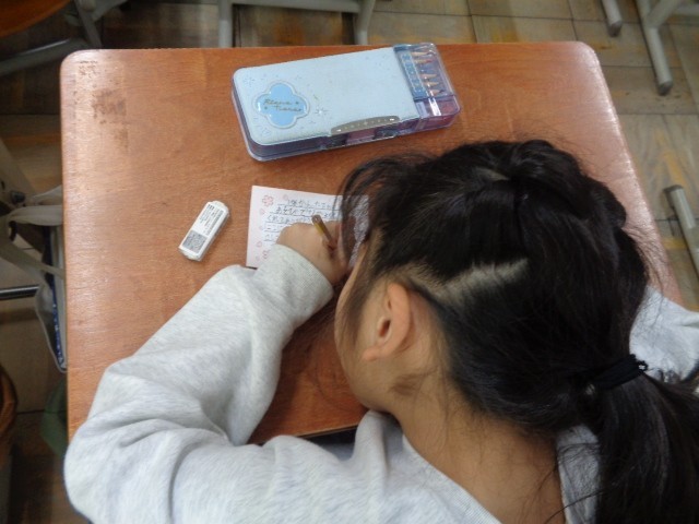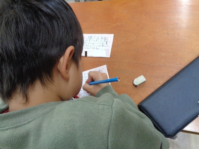 今までの感謝の気持ちを込めて、カードに一生懸命メッセージを書いています。