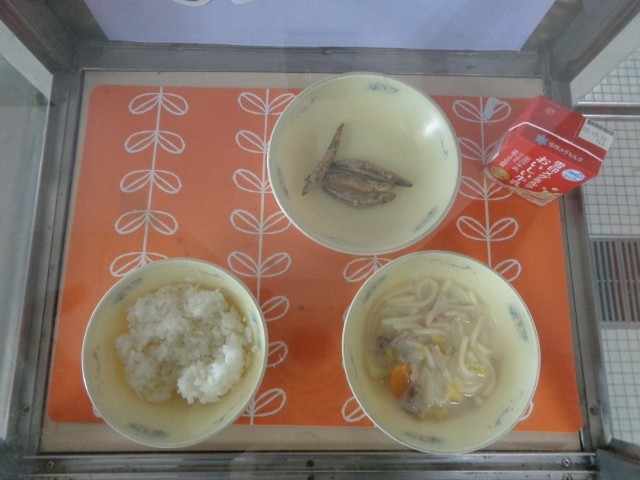 本日の給食の献立は、ごはん、牛乳、きびなごのこはくあげ、豆乳なべ(うどん入り)でした。