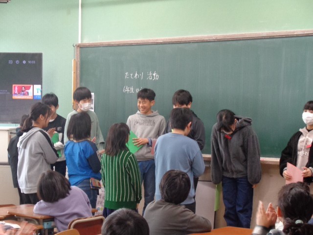 たてわりグループで1年間を振り返った後は、1~5年生からのサプライズで、6年生へプレゼントを渡しました。間もなく卒業を迎える6年生へのメッセージカードです。