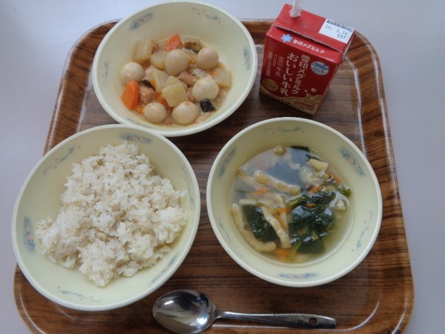 今年度最後の給食の献立は、麦ごはん、牛乳、油揚げと青菜のスープ、プリプリ中華炒めでした。