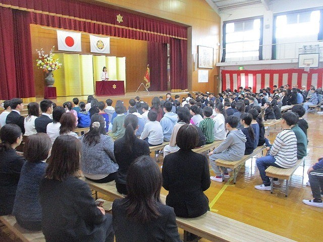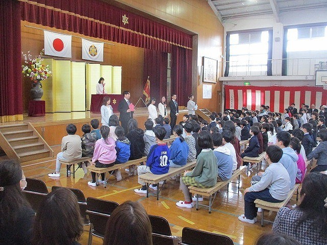 令和8年度入学式を行いました。今年度の新入生は59名です。立ったり座ったりお辞儀をしたりするなど、しっかりと先生のお話を聞いて行動する立派な1年生の姿を見せてくれました。
