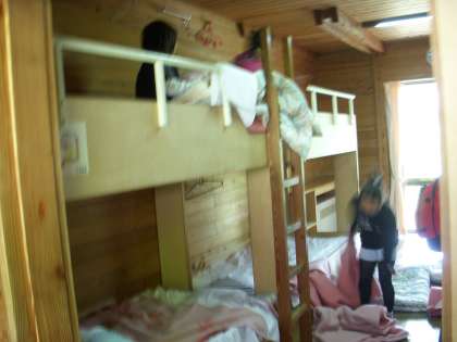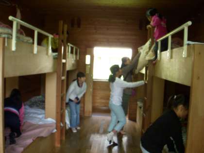 弁当の後はシーツをもらって部屋で布団の準備をします。一人で長いシーツを扱うのは手間がかかります。そこで協力、助け合いです。「そっち持って」「ありがとう」と声かけ合いながら敷いていました。
