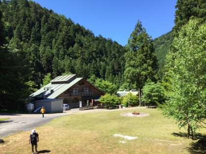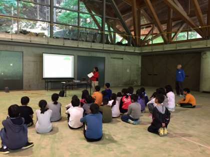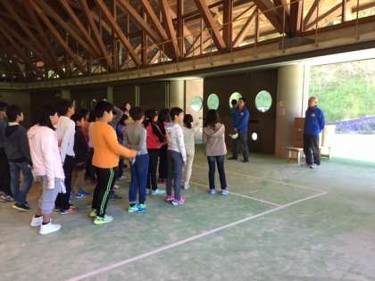 翠峰荘で入所式をしました。スタッフの方から林業体験の説明を聞いています。