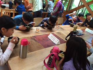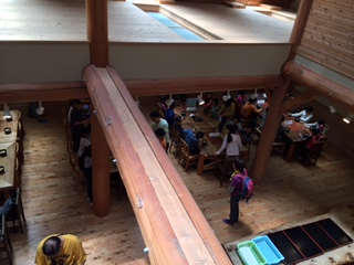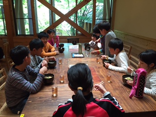 林業体験でたっぷり汗を流した後は昼食のきつねうどんを美味しくいただきました。  木の香りのする吹き抜けのレストランで木漏れ日が心地よいです。
