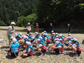 ライフジャケットをつけて安全に気をつけて水の中の生き物を探します。