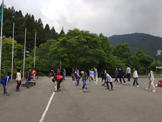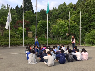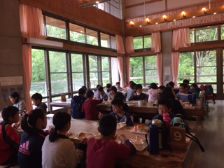朝の集いで体操をした後は朝ごはんを食べ、来た時よりもきれいに部屋を片付けました。
