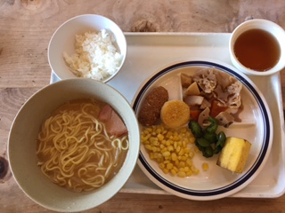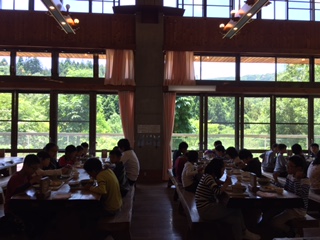 山の家最後の昼食タイム。鳥照り丼か味噌ラーメンか選んで食べています。