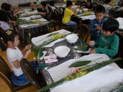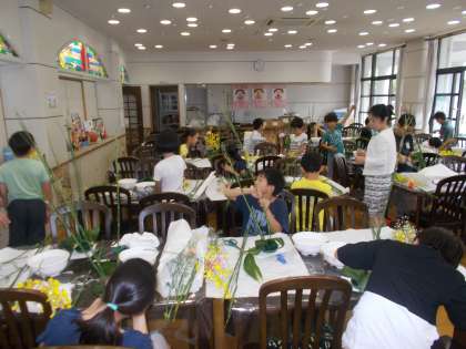 花育活動で専慶流家元の西坂先生に来ていただき,生け花を教えていただきました。七月の節句「七夕」をイメージした作品を作りました。学校の本校舎一階に展示しています。