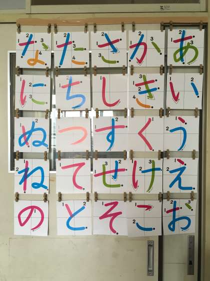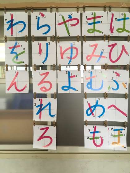 本日ひらがなの学習が終わりました。毎日1文字ずつ新しいひらがなを学習し、宿題でも頑張った子どもたち。おうちの方にもたくさん励ましていただいたことと思います。子どもたちは、鉛筆の持ち方、座り方に気を付けながら練習をすることで、文字を書く力がついてきています。これからは、書き順や鏡文字にならないように気を付けながら、言葉や文を書く際に、文字の定着を図っていきたいと思います。