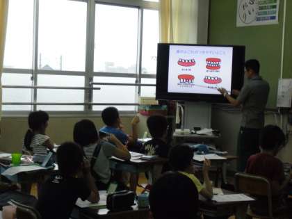 4年生からは染出し錠で赤くなった汚れを、歯鏡を使って歯の裏側まで点検します。