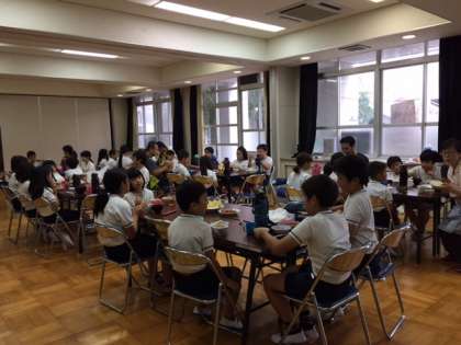 朝ごはんは,具だくさんのみそ汁にたきたてごはん,ウインナー,デザートはリンゴ。しっかりエネルギーをチャージした後はミニ運動会です。