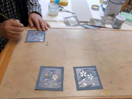 10月27日(金)、地域の芦田金彩工芸さんで京友禅の工程の一つである金彩の体験をさせていただきました。職人さんが使われる道具を使って、金粉をつけたり金箔を貼ったりさせていただきました。色の変化を出るように工夫して、素敵な作品ができあがりました。