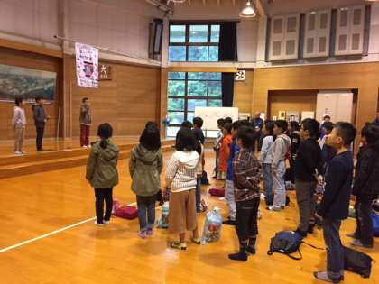 明るくて広いプレイホールで入所式です。みさきの家の方々があたたかく迎えてくださいました。皆で相談して作った旗を掲げ、校歌を歌いました。「3日間、友達と協力しながら一生の思い出をつくるぞ」との思いを新たにしました。司会も校歌の指揮も旗揚げも係が中心に進めます。