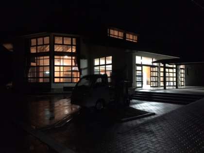 お風呂に入った後は荷物整理をしてタオルを干してプレイホールに集合。夜に明かりのついたプレイホールはとてもきれいです。