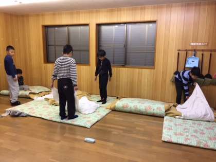 6時起床とともに寝具の片付けや身支度にかかります。全員元気、おなかもペコペコです。外は雨ですが今日も一日がんばるぞー!
