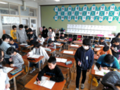 まずは,席を交換してお互いの自主勉強ノートにコメントを書き入れました。その後,自由に歩き,それぞれのノートを見てまわるようにしました。一人で学習を続けていくことは,なかなか難しいことですが,同じ努力をしている仲間がいるからこそ,次の日へのふんばりやがんばりがききます。その仲間がノートにコメントを書いてくれて,応援してくれたら,さらにやる気も湧いてきます。また,相手を元気づけることは,自分のがんばりにもつながります。