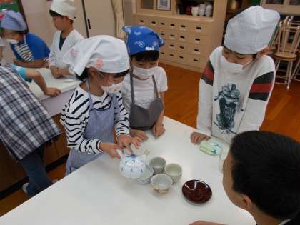 お茶の入れ方を学習し,お茶を入れました。ガスこんろを安全に使い,お茶を入れ,グループで団らんのときを楽しく工夫しました。ぜひ家庭でも実践してほしいです。
