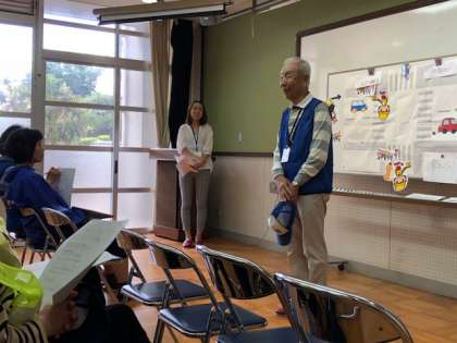 PTA,保護者,地域の方々にお世話になり,立ち番安全講習会がありました。登校時の子どもたちの安全のための立ち番の仕方についての説明がありました。これから1年間,子どもたちがお世話になります。どうぞよろしくお願いします。