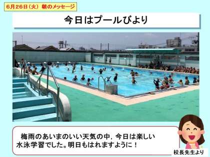 昨日今日と蒸し暑い日が続いています。きのう,きょうと水泳学習にはうってつけのお天気で,プールから歓声がひびきわたっています。