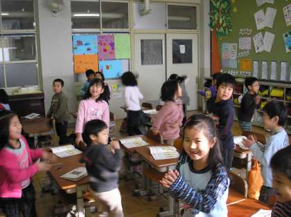 音楽で「とんくるりん ぱんくるりん」を歌いました。「まわれまわれ たのしく」という歌詞に合わせて,子どもたちは踊りながら歌っていました。