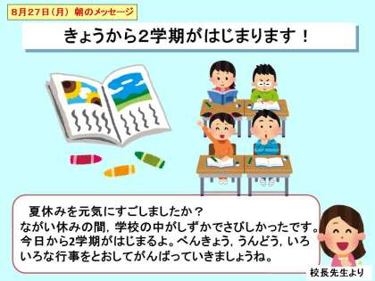今日,みなさんと久し振りに会えてとっても嬉しいです。夏休みだからできたこと,夏休みにしかできないことをいっぱいやって,きっといい時間を過ごしたのだろうな,と思いました。