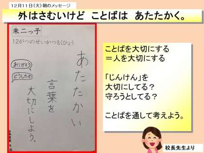 12月の人権月間に関連して,児童会が提案する毎月の生活目標は「あたたかい言葉を大切にしよう」です。