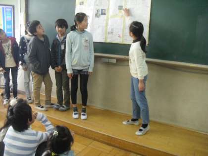 4年の総合的な学習のテーマは「福祉」でした。1学期は,朱二校区のやさしさみつけや校内のやさしさみつけをしました。2学期は,「施設があったり設備が整っていたりすることがやさしさかな。」という疑問をもとに,困りを抱えている人について調べて,それぞれでまとめました。ほほえみ交流事業では,身体に障害のある方を講師としてお招きし,障害者スポーツ「卓球バレー」を一緒に体験しました。3学期は,2020年に東京で行われるパラリンピックに注目し,「みんなで応援したい!」という思いから,様々な競技のリーフレットをつくりました。そして,今回はその総まとめの時間に3年生に来てもらい,これまでの学習の発表と,リーフレットにある競技の紹介をしました。これまで「オリンピックは知っているけど・・・。」という人が多かったのですが,この授業のあと「パラリンピックも早くみてみたい!!」という感想が聞けました。3年生ありがとう。