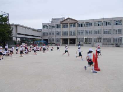 今日の体育は、運動場でリレー遊びをしました。円い形のバトンをもって、どの子も一生懸命走っていました。来週もまたがんばって走りましょう。