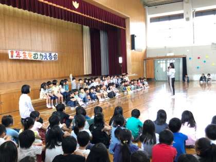 1年生を迎える会がありました。6年生に手をつないでもらって入場した1年生。全校で「○×クイズ」や「じゃんけんれっしゃ」をして遊びました。2年から6年生が協力して作ったメダルをプレゼント。6年生が首にかけてくれ,得意そうに満面の笑顔でありがとうを言った1年生です。