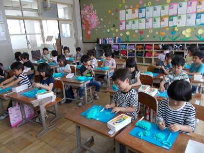 今日の図工は粘土を使いました。初めに、サイコロやボールやヘビを作った後、細いひものかたちに伸ばした粘土を使って作品を作りました。カタツムリや橋、リボンや文字など、いろいろなものを作って楽しみました。
