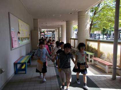 2年生と一緒に学校たんけんをしました。やさしく手をつないでくれるおにいさん、教室の前のポスターをゆっくり読んで教えてくれるおねえさんのおかげで、学校のことがわかってきました。たんけんの最後には、学校の地図ももらいました。教室にもどってからも「たのしかった」「いろいろおしえてもらってうれしかった」「こんどはじぶんたちでもいってみたいな」など、話していました。