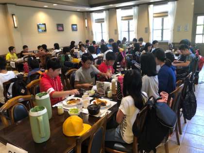 外国の建物のようなレストランでデザートのプリン付きハンバーグランチを美味しく食べました。
