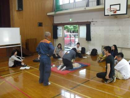 プール開きを前に,中京消防署の方に講師として来ていただき,朱四小,朱六小と合同で救命講習を行いました。心肺蘇生法について説明を聞いた後,実際に訓練をしました。人工呼吸をしたり,AEDを使用したりしました。万一のときの役割の確認や正しい心肺蘇生の方法を学ぶことができました。