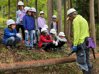 間伐体験をするために裏山に登りました。ノコギリを引いて丸太を切っています。