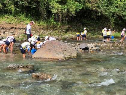 ライフジャケットをつけて川にすむいきものを探します。清流の水は冷たくていい気持ち。
