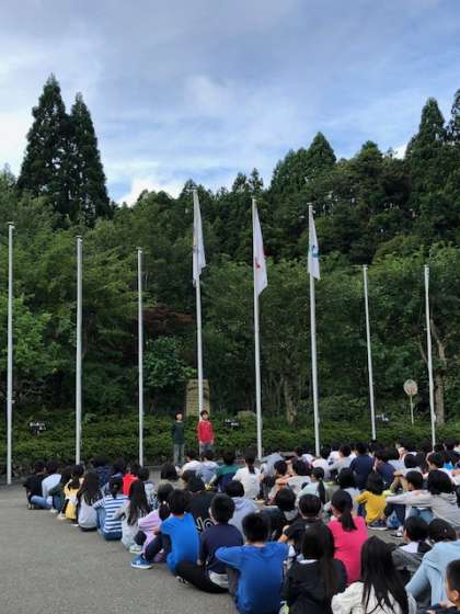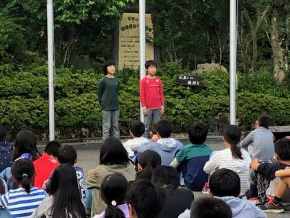 4校合同の朝のつどいでは、代表の子が他校の子供たちの前で朱二校の紹介をしました。たくさんの人の前で堂々と発表し、大きな拍手をもらいました。