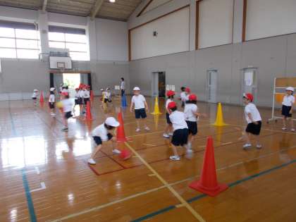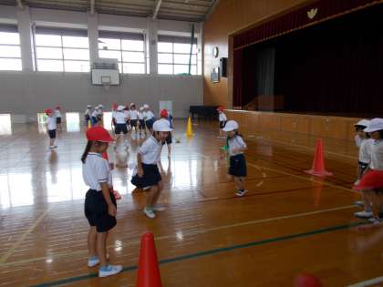 体育では、ころがしドッヂボールをしています。ルールにもだんだん慣れ、すばやくボールを転がしたり、上手に逃げたりできるようになってきています。