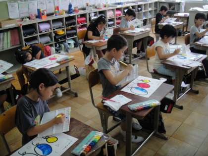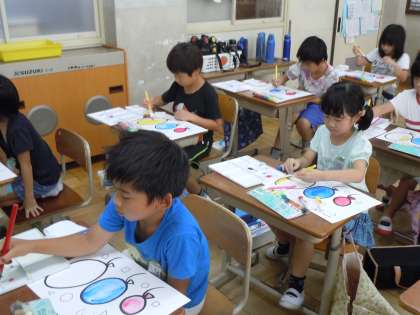 今日は,待ちに待ったはじめての絵の具の学習!真新しい絵の具セットを前に「早く使いたい!」とウキウキしている子どもたちでした。初めての今日は,パレットや筆,筆洗の使い方について学習した後,3色の絵の具を使って,色を塗ってみました。一言もしゃべらず,集中して色を塗る姿から,子供たちの一生懸命さが伝わってきました。