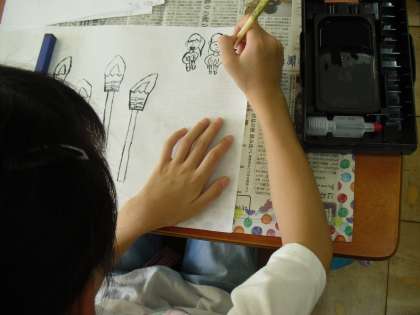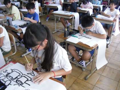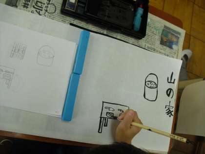 山の家から帰ってきて1週間が経とうとしています。「星空がきれいで土星の輪が見えたなぁ。」「川の中で魚つかまえたわ。」思い出を話しながら,絵にしたいことを決めて,障子紙に描いています。山の家五七五にも思いがいっぱいです。色付けをして20日の学習発表会で掲示します。