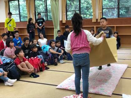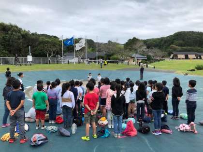 入所式では、みさきの家のルール「5分前行動」「来たときよりも美しく」「挨拶」を確認して、校歌を高らかに歌って、学校の旗をあげました。「気持ちのよい挨拶ができて、素晴らしいですね」と早くも褒められました。ふとんやシーツのたたみ方を習って、しばふ広場で全員写真を撮りました。