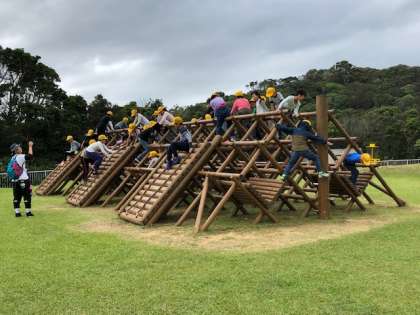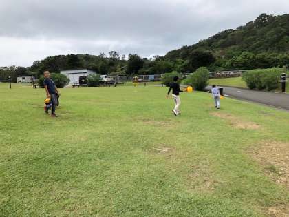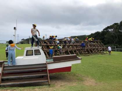 しばふ広場で半時間ほど自由時間ができました。バッタを捕まえたり、遊具で遊んだり、走り回ったり、転げ回ったり。こんな運動場、学校にもほしいなあ。