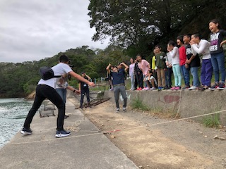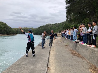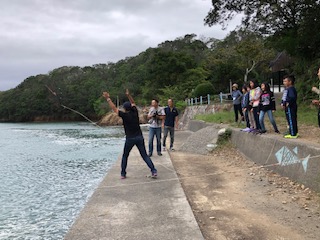 深谷水道のところで、エサを入れたしかけ網を投げます。「タツノオトシゴ」「イセエビ」とグループでかかってほしい海の生き物を大きな声で言うと同時に先生が網を投げ入れます。明日、網を引き揚げます。かかっていますように!