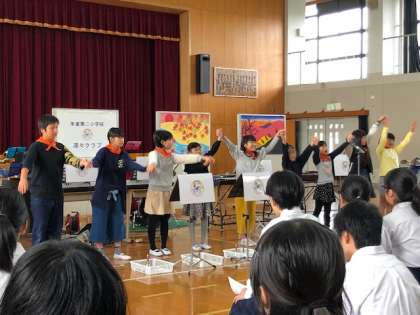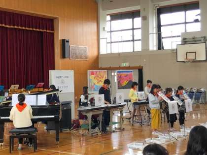 毎年恒例のりんりんのけやきコンサートの会場はお客さんでいっぱい,演奏を聴くだけでなく,一緒に歌ったり,手拍子をしたり,リズム遊びにチャレンジしたりと楽しいひとときを過ごしました。西ノ京中学校吹奏楽部の先輩たちの演奏も聴きました。