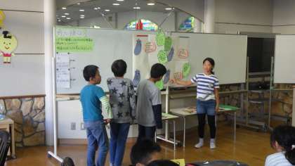 給食で毎日いろいろな野菜が使われているのはなぜかを自分で考えた後,グループで交流し発表しました。