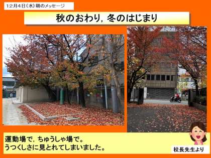 毎日見慣れている風景でも,季節によって違いがあります。つい2週間前くらいまで,落ち葉はきにヘトヘトになっていた掃除担当の4年生が「校長先生,この頃,落ち葉が減りました」と今日,話していました。
