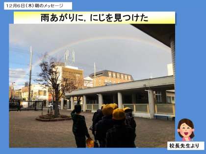 放課後,通り雨の後に誰かが言いました。「虹,虹が出ている!」そこに子供も大人もたくさん集まって,しばし空を見上げて美しい光のスペクトルに見とれていました。