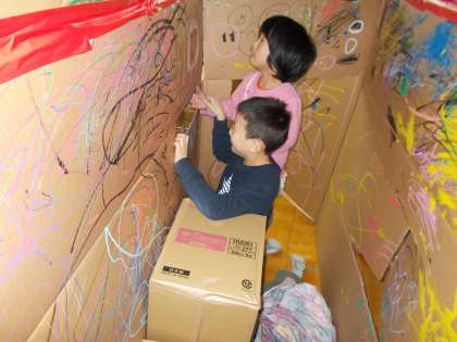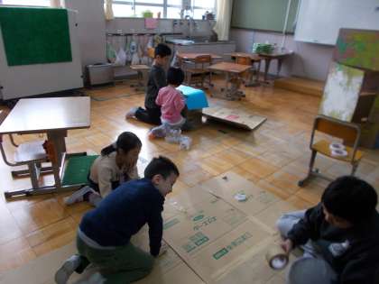 図画工作「家を作ろう」をしました。子供たちが協力して,屋根やキッチンを作って,家が完成しました。子供が家の中で立っても屋根に当たらず,みんなが入れるくらいに大きいです。この家で,みんなと遊びたいですね。