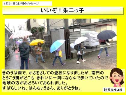 きのうの朝は雨でした。傘をさして,整然と一列に並んで班長さんの後をついて登校しています。班長さんは皆がちゃんとついてきているか,後ろに気を配って歩いてくれています。年長の子が小さい子の面倒を見る朱二っ子のよき伝統がずっと続いてほしいです。