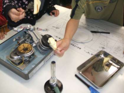 食品をあぶって試食する活動では,給食前のちょうど少しお腹がすく時間であったことも手伝って,みんな大喜び!!ウインナーやチーズなどを,ガス火であぶって,おいしそうに試食していました。