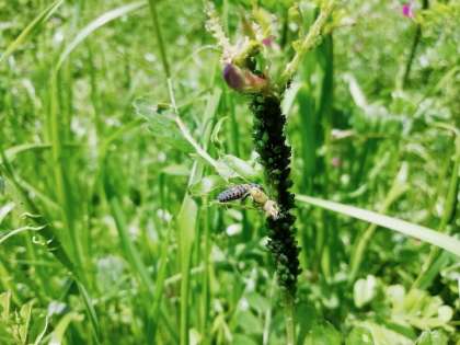 カラスノエンドウの茎を見ると,びっしりとアブラムシがついていました。